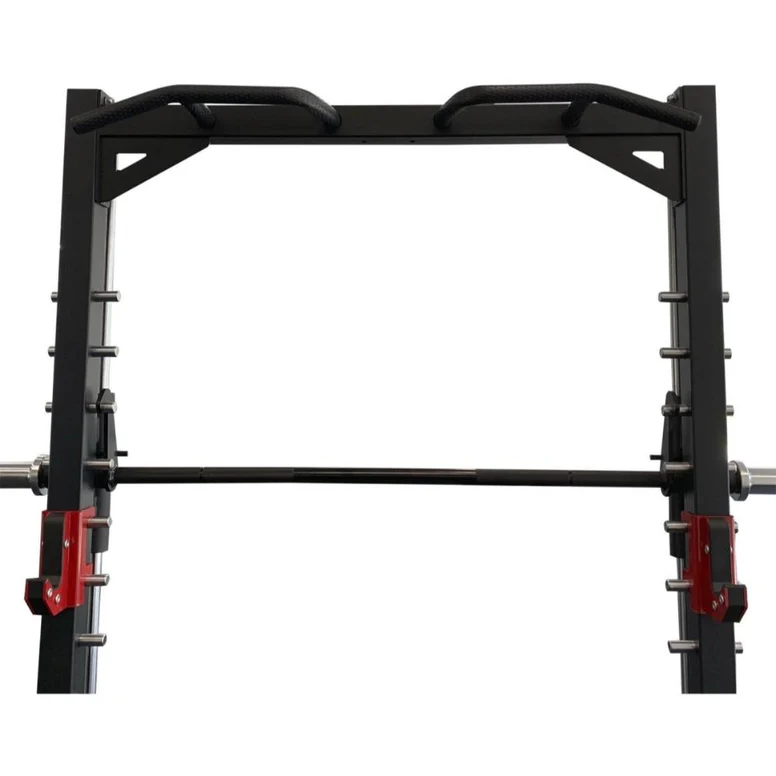 Key features include multi-grip chin-up handles with improved texture, commercial-grade Smith guide rods, and a linear bearing Smith bar with rotating sleeves. The Smith Bar with its bearings weighs 22kg, providing more weight load compared to a standard Olympic bar (20kg). The Smart hook Smith bar allows for easy mounting and unmounting, and the fully adjustable Smith bar safety spotter ensures maximum safety during heavy lifts. The machine also boasts extra robust J-hooks and long spotters with a double hook locking design, along with Olympic weight plate and bar storage. The 2mm thick heavy-duty steel construction guarantees durability and stability.